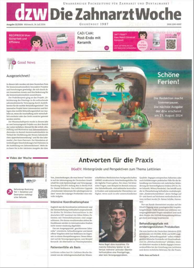 Avec le Prof. Dr Alexander Welk (Université de Greifswald), le Dr Michael Patyna (Université de Mayence), le Prof. Dr Anahita Jablonski-Momeni (Université de Marbourg), PD Dr Gerhard Schmalz (Université de Leipzig) et l’hygiéniste dentaire Vanessa Faber (Medical School 11, Heidelberg), le modérateur Prof. Dr Dirk Ziebolz (Université de Leipzig) et le Prof. Dr Werner Birglechner (praxisDienste Institut für Weiterbildung) ont invité des experts reconnus issus de différents domaines de la médecine dentaire.