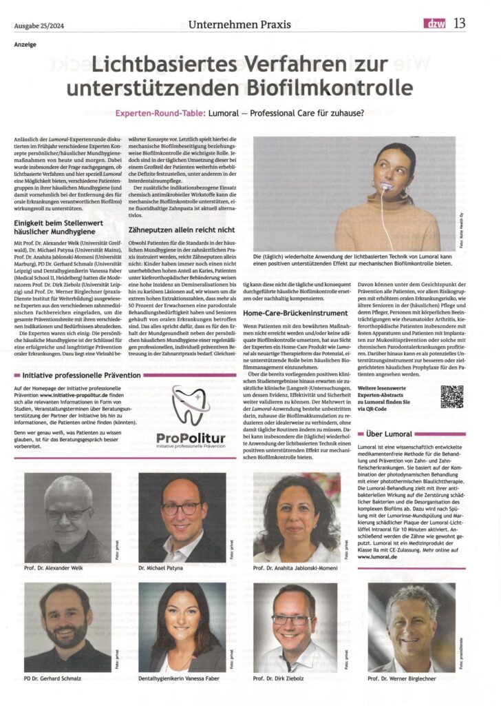 À l’occasion de la table ronde d’experts Lumoral, différents experts ont discuté des concepts d’hygiène bucco-dentaire à domicile. Ils se sont notamment penchés sur la question de savoir si et comment Lumoral peut aider efficacement différents groupes de patients dans leur hygiène bucco-dentaire à domicile.