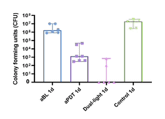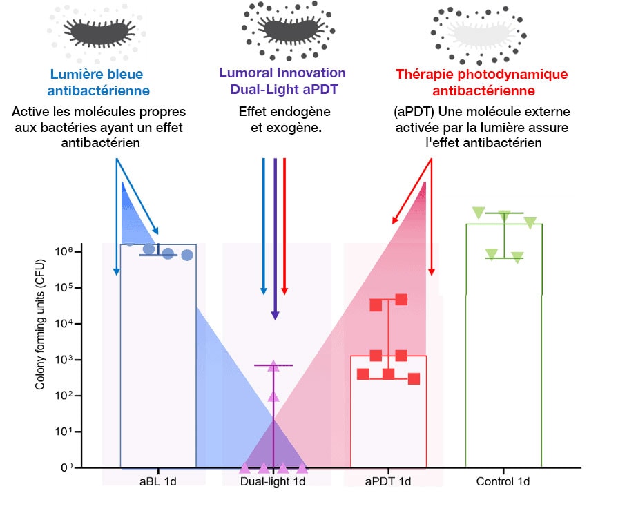 L’effet antibactérien de Lumoral repose sur la « méthode Dual-Light », qui combine la photothérapie thermique (lumière bleue antibactérienne – aBL) et la thérapie photodynamique antibactérienne (aPDT).