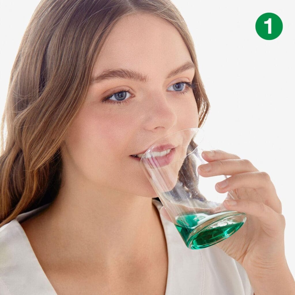 Spülen Sie Ihren Mund 60 Sekunden lang mit der frisch nach Minze schmeckenden Lumorinse-Spüllösung. Der lichtempfindliche Farbstoff ist so konzipiert, dass er an der Plaque haftet.